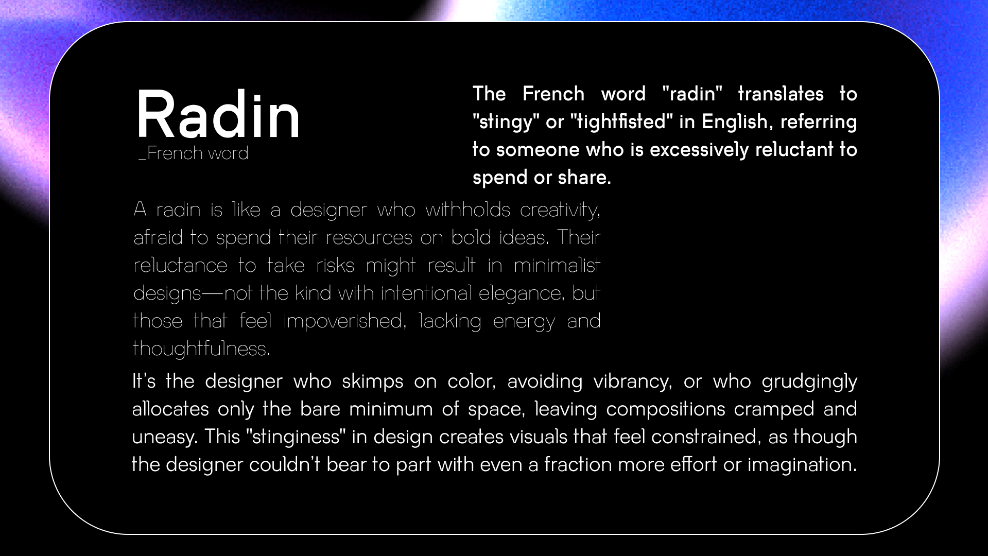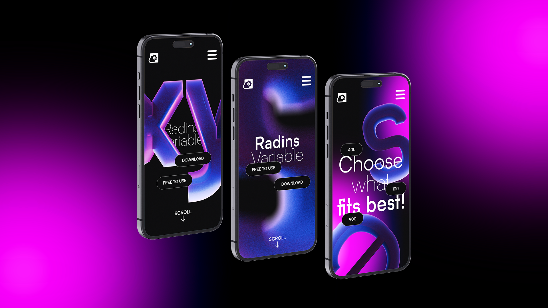 Radins Variable is a versetile modern Sans Serif Font. The main objective was to make a typeface that's easy to read, but also usable as a display font that's pleasing to the eye.